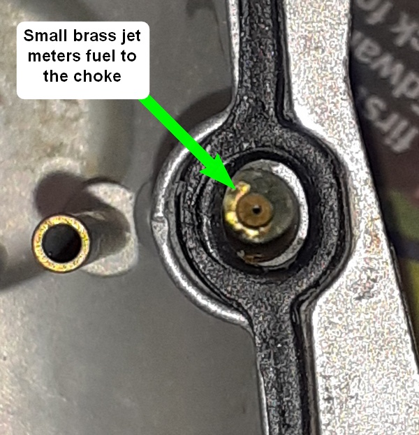TIP: Check your accelerator pump is working properly BEFORE you strip the carb. The accelerator pump nozzle has a hole facing into the carb as shown in the photo below. To check its operation remove the carb with fuel in the float bowl and operate the throttle which should squirt a visible stream of fuel into the carb. If it doesn't then the diaphragm is suspect.