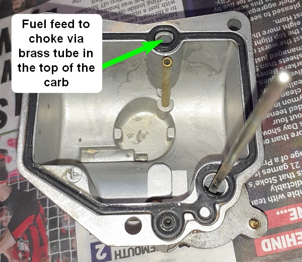 The photo below shows the carb stripped as far as you need to go if just cleaning jets. My advice is NOT to take the float assembly off without very good reason as you risk breaking the support post arrowed in red in the photo below. The retaining pin is usually very tight. If the worst happens and you need to repair a broken post, there is a step-by-step photo guide here.